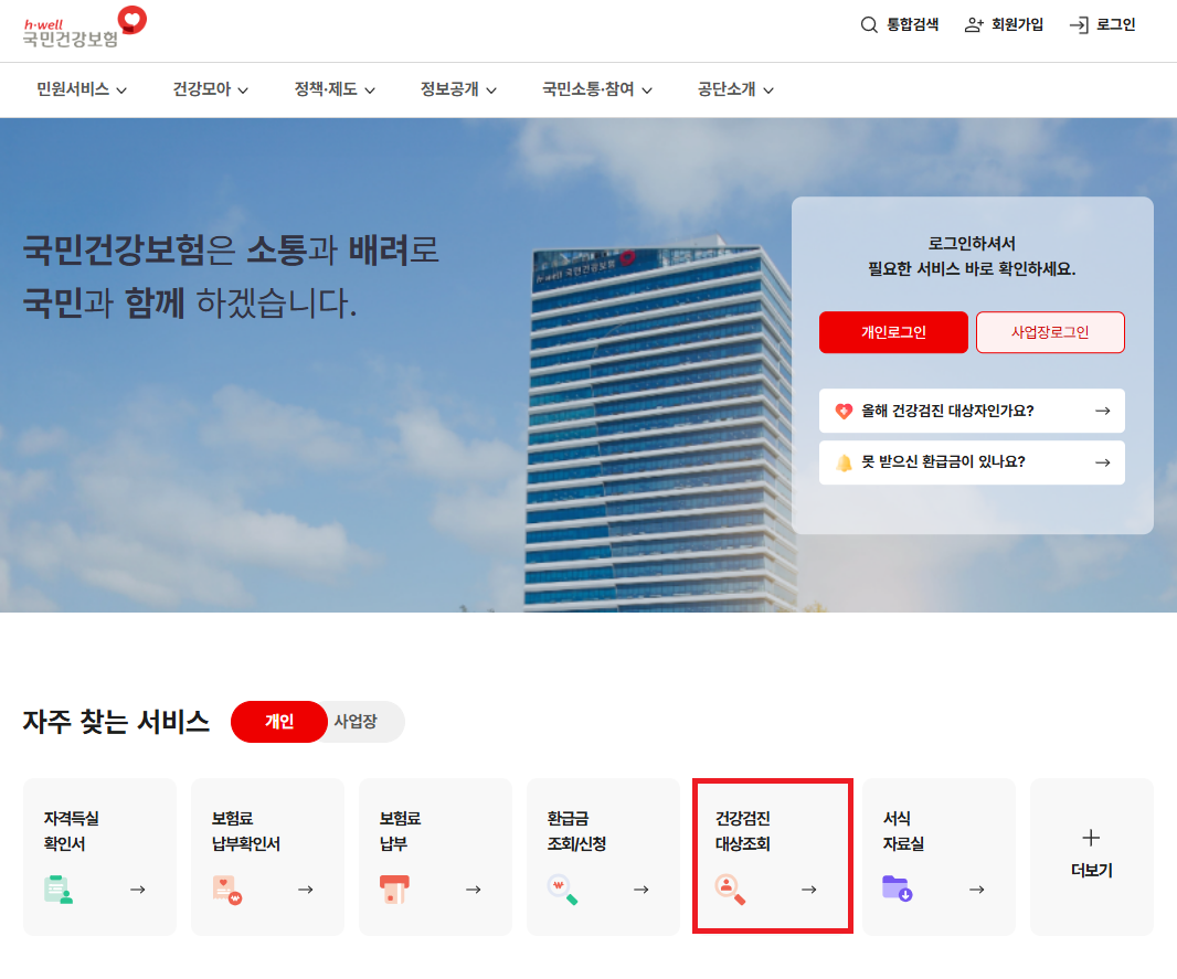 건강검진 대상자는 국민건강보험 사이트에서 로그인을 한 후 조회 할 수 있습니다.