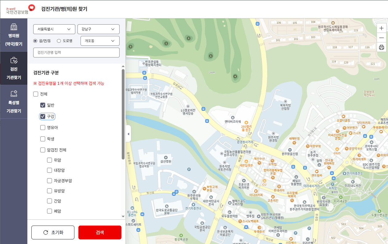 검색의 수고를 줄여주기 위해 국민건강보험 사이트에서 지역별로 건강검진을 진행하는 병원을 검색할 수 있는 페이지를 지원합니다.